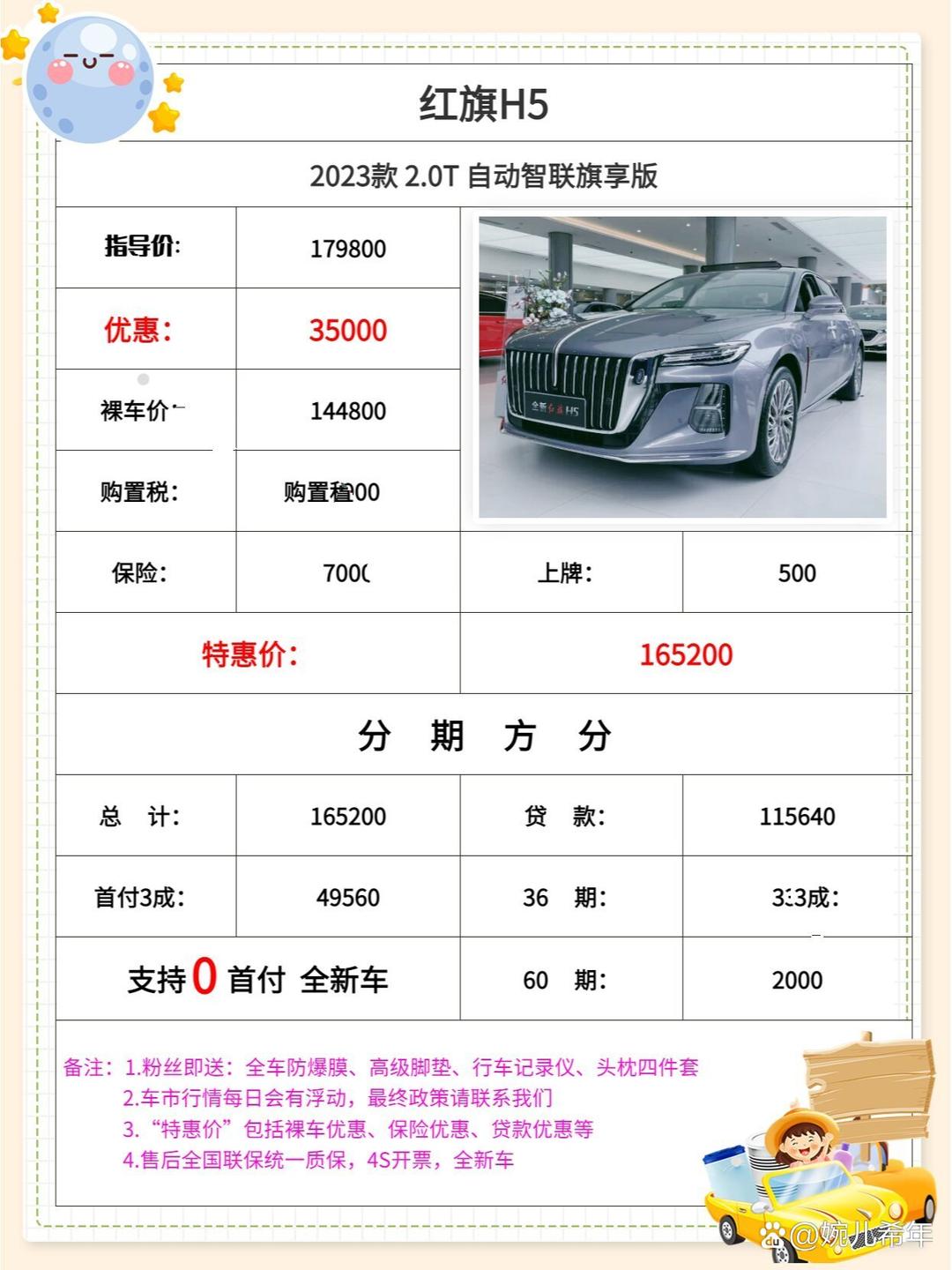 红旗H5 2023款的落地价主要由以下几个方面构成: